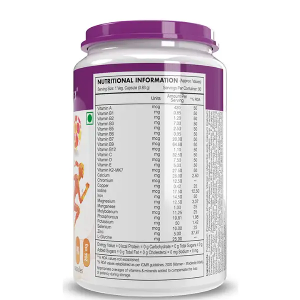 Vitamin A, Vitamin D3, Vitamin E, Vitamin K2Mk7, Vitamin C, Vitamin B1, Vitamin B2, Vitamin B3, Vitamin B5, Vitamin B6, Biotin (B7), Folic Acid (B9), Vitamin B12, Iron, Calcium, Zinc Magnesium, manganese, Copper, Iodine, Chromium, Selenium, Molybdenum, Potassium, Phosphorus, L Glycine, MCT Oil Powder